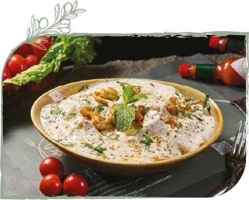 Fatteh mix with yogurt, topped with fried bread, cinnamon, pine nuts. | 混合酸奶拌饼,配油炸面包、肉桂和松子